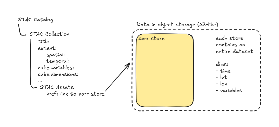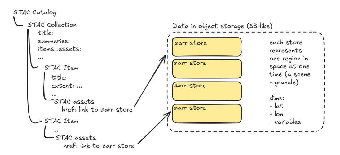 - In each STAC item include one asset with an href link to the Zarr containing that data.