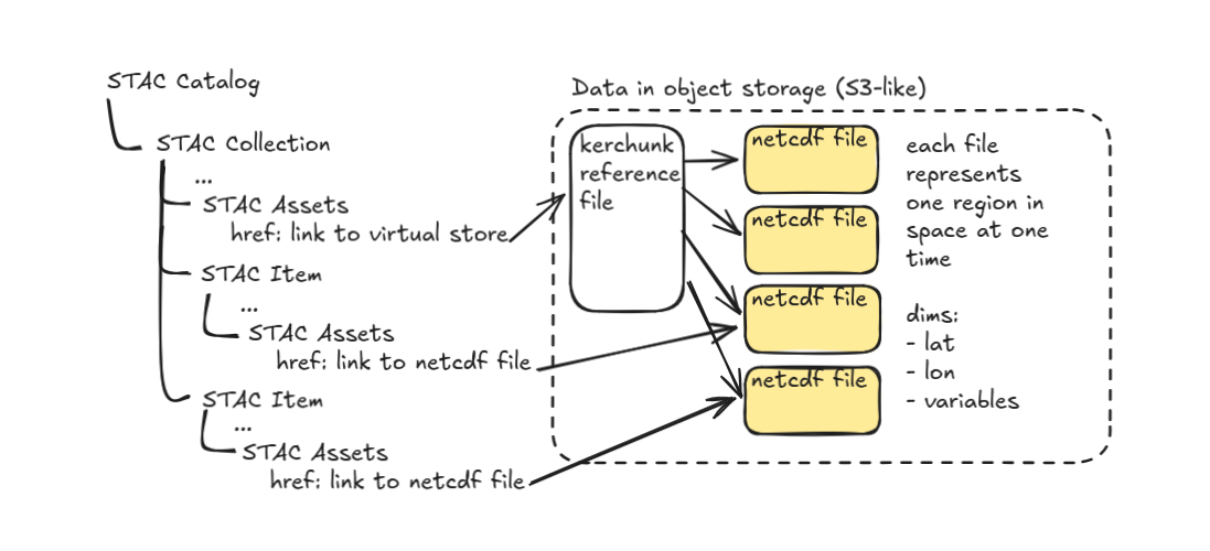 - In each STAC item include one asset for each variable with an href link to a chunk of data on-disc and a property containing the kerchunk reference.